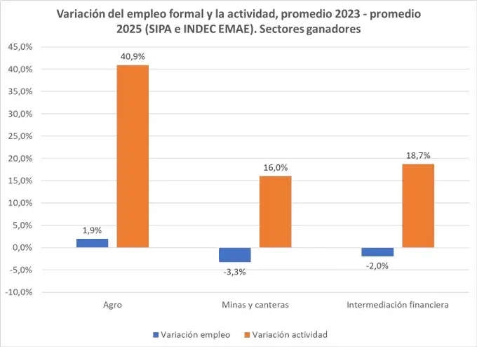 La conclusión de Campos es contundente: los sectores ganadores del modelo —agro, minería, petróleo y finanzas— no generan nuevos puestos de trabajo formales, mientras que los sectores que retroceden —industria y construcción— expulsan masivamente mano de obra. Entre ambos, dejaron afuera a casi 120.000 trabajadores.