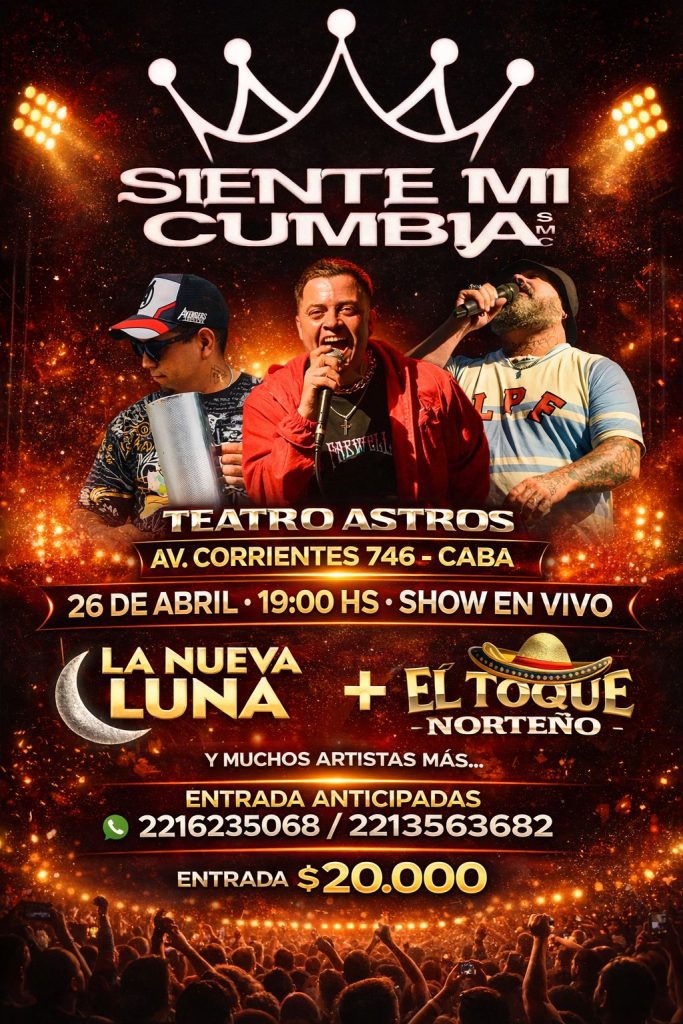 La banda Siente Mi Cumbia, integrada por artistas de Ensenada, se presentará el 26 de abril a las 19 horas en el Teatro Astros, ubicado en Avenida Corrientes 746, en la Ciudad de Buenos Aires.