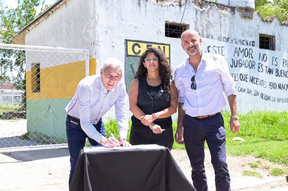 La directora ejecutiva del Organismo Provincial de Integración Social y Urbana (OPISU), Romina Barrios, y el intendente de Berisso, Fabián Cagliardi, firmaron el contrato para